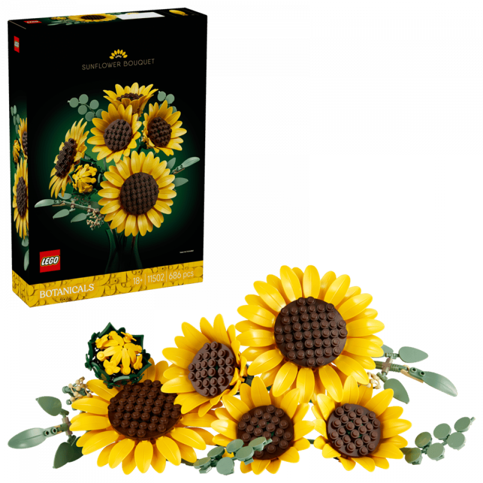 LEGO Botanicals 11502 Sunflower Bouquet bestaat uit 686 stenen en bereikt een hoogte van 36 cm. De prijs is €59,99. Releasedatum: 1 maart 2026. Aanbevolen leeftijd: 18+.