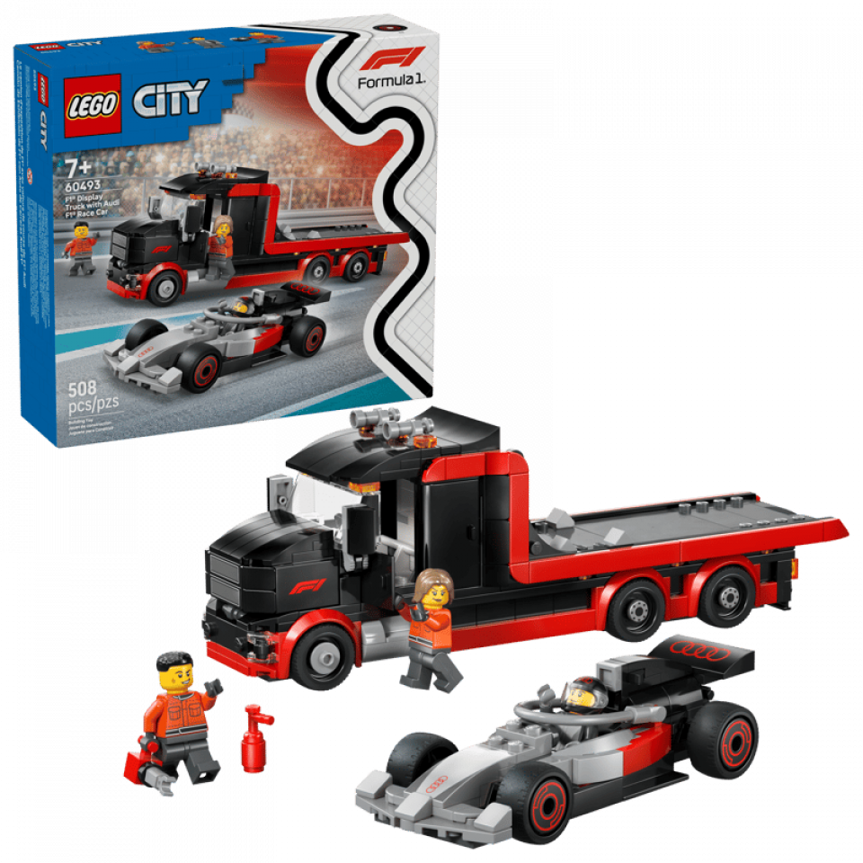 LEGO City 60493 F1 Display Truck with Audi F1 Race Car bevat 508 stenen en 3 minifiguren. De afmetingen zijn 8 cm hoog, 24 cm lang en 7 cm breed. De prijs is €44,99. Releasedatum: 1 maart 2026. Aanbevolen leeftijd: 7+.