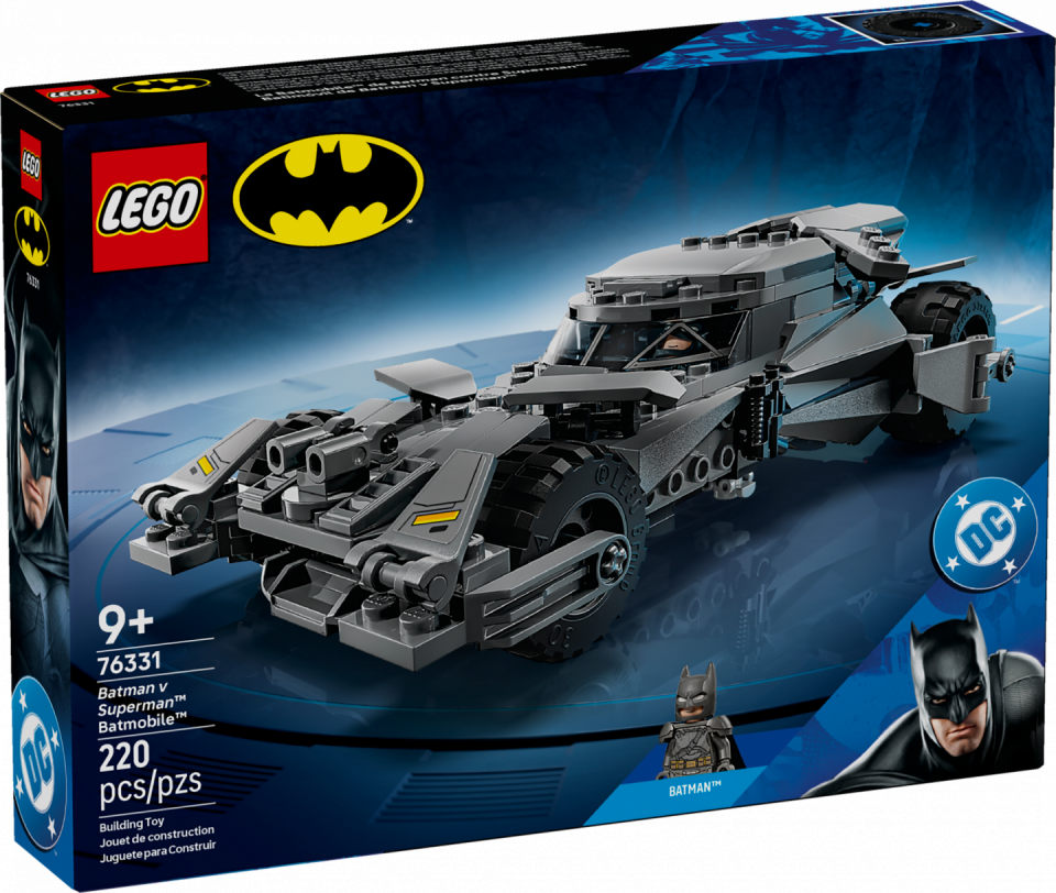 LEGO DC 76331 Batman v Superman Batmobile telt 220 stenen en 1 minifiguur. De afmetingen zijn 5 cm hoog, 18 cm lang en 10 cm breed. De prijs bedraagt €29,99. Releasedatum: 1 maart 2026. Aanbevolen leeftijd: 9+.