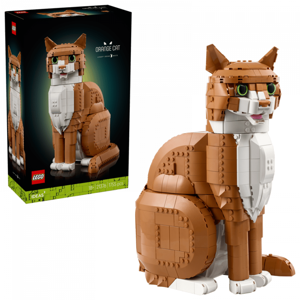 LEGO Ideas 21376 Orange Cat bevat 1755 stenen en meet 32 cm hoog en 24 cm breed. De prijs bedraagt €99,99. Releasedatum: 1 maart 2026. Aanbevolen leeftijd: 18+.
