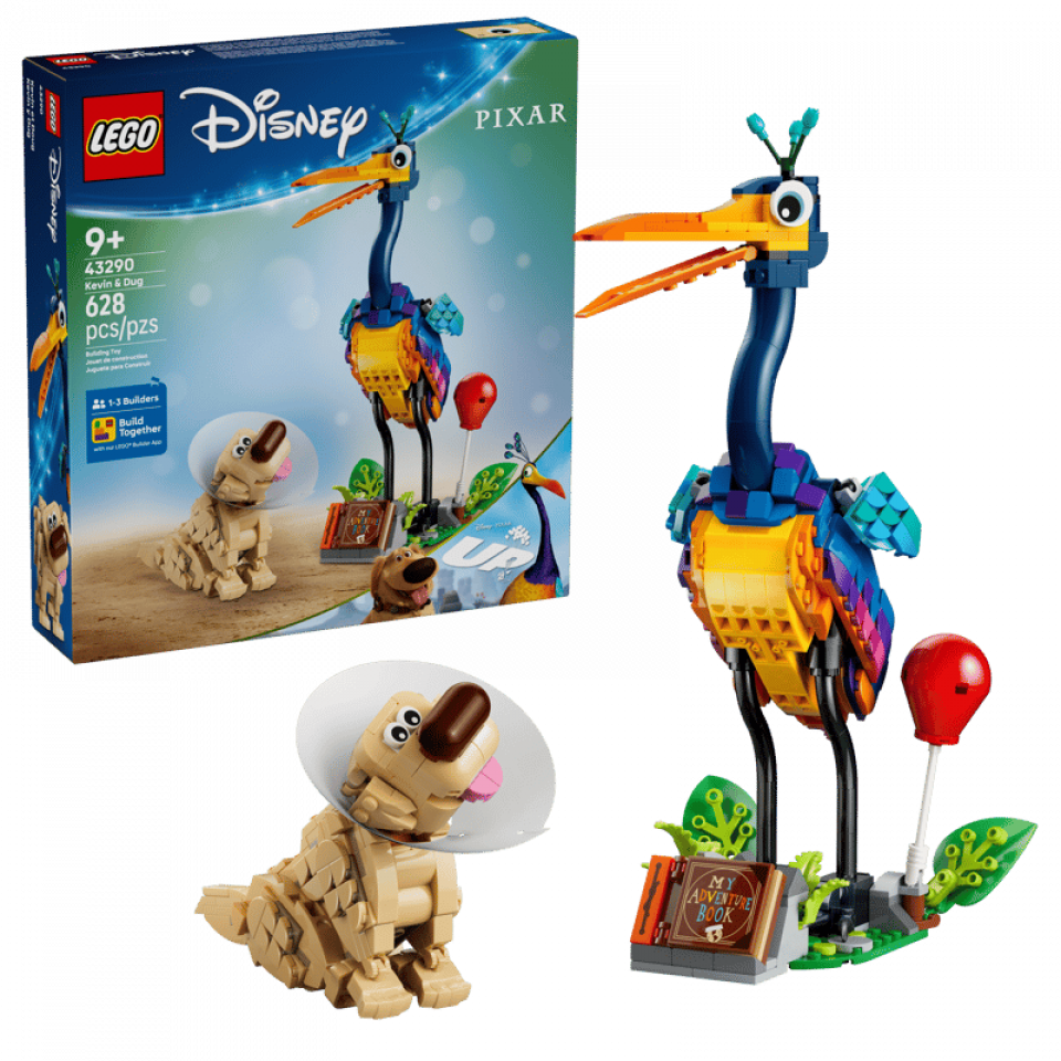 LEGO Disney 43290 Kevin & Dug telt 628 stenen. Het model meet 29 cm hoog, 12 cm breed en 16 cm diep. De prijs bedraagt €59,99. Releasedatum: 1 maart 2026. Aanbevolen leeftijd: 9+.
