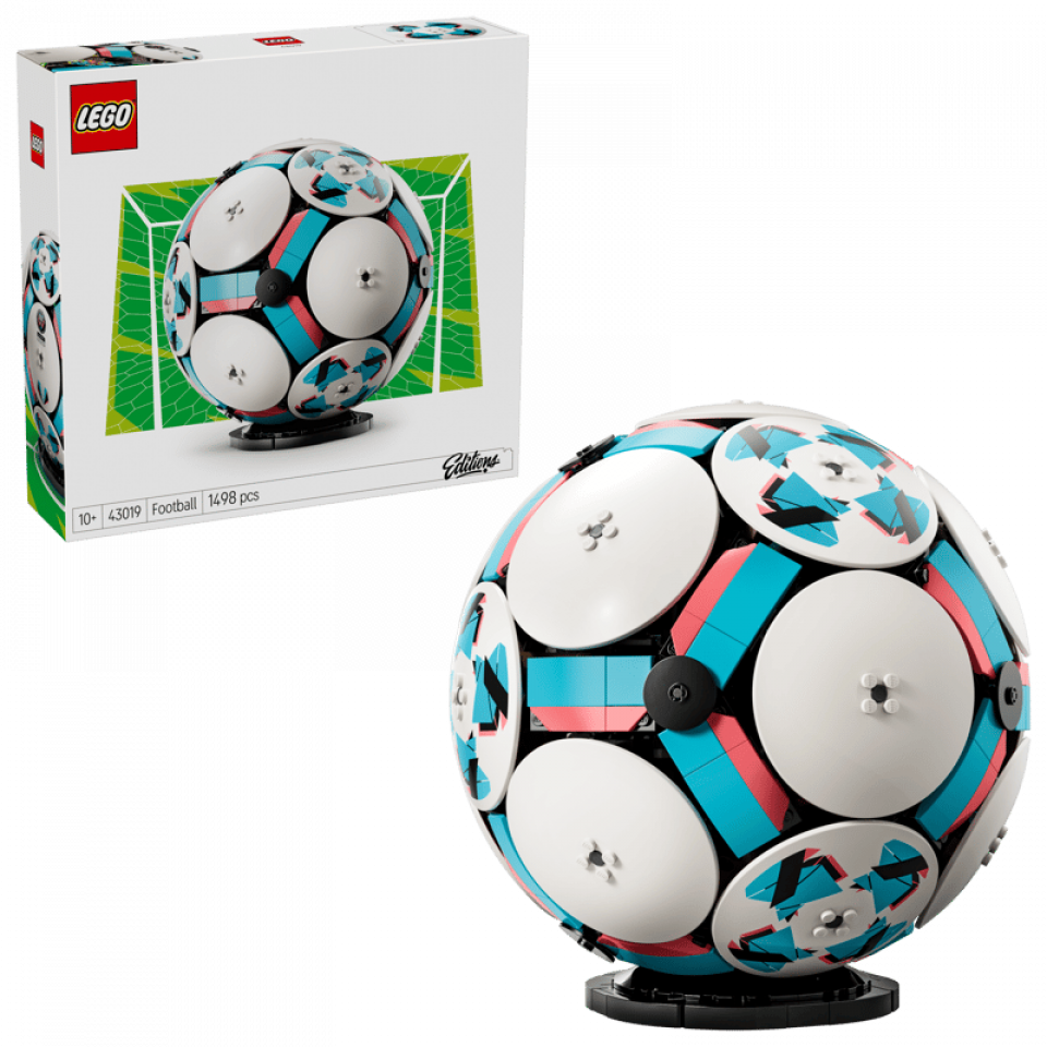LEGO Editions 43019 Soccer Ball telt 1498 stenen en meet 22 cm hoog, 21 cm breed en 21 cm diep. De prijs is €119,99. Releasedatum: 1 maart 2026. Aanbevolen leeftijd: 18+.