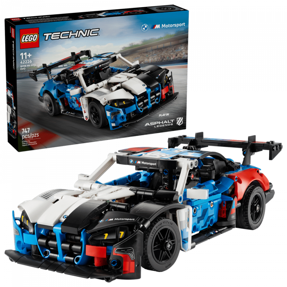 LEGO Technic 42226 BMW M4 GT3 EVO Race Car telt 747 stenen en meet 8 cm hoog, 29 cm lang en 13 cm breed. De prijs bedraagt €64,99. Releasedatum: 1 maart 2026. Aanbevolen leeftijd: 11+.