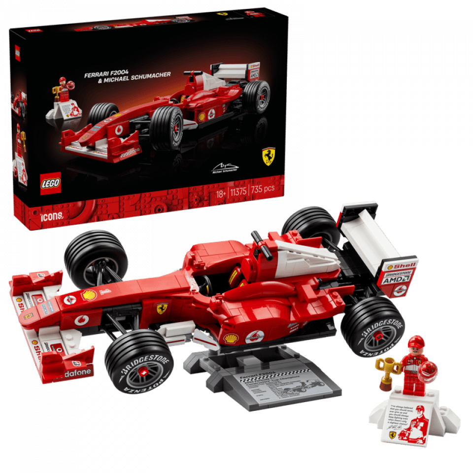 LEGO Icons 11375 Ferrari F2004 & Michael Schumacher bevat 735 stenen en 1 minifiguur. Het model meet 7 cm hoog, 32 cm lang en 13 cm breed. De prijs bedraagt €89,99 (pre-order). Releasedatum: 1 maart 2026. Aanbevolen leeftijd: 18+.