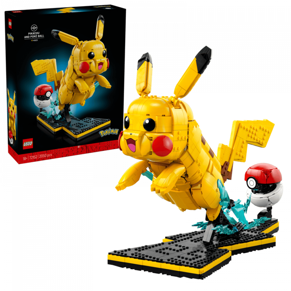 LEGO Pokémon 72152 Pikachu & Poké Ball bevat 2050 stenen en meet 35 cm hoog, 26 cm breed en 39 cm diep. De prijs is €199,99. Releasedatum: 27 februari 2026. Aanbevolen leeftijd: 18+.