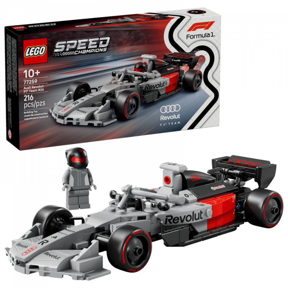 LEGO Speed Champions 77259 Audi Revolut F1 Team R26 Race Car telt 215 stenen en 1 minifiguur. De afmetingen zijn 4 cm hoog, 19 cm lang en 7 cm breed. De prijs bedraagt €27,99. Releasedatum: 1 maart 2026. Aanbevolen leeftijd: 10+.