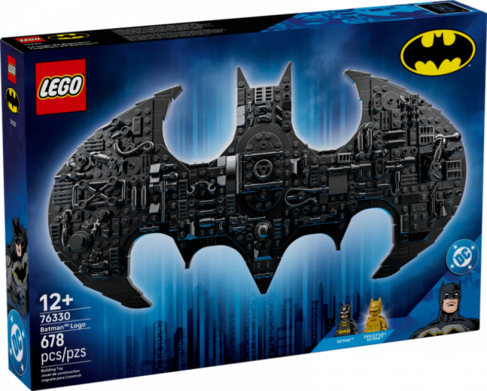 LEGO DC 76330 Batman Logo bevat 678 stenen en 2 minifiguren. De afmetingen zijn 23 cm hoog, 36 cm breed en 9 cm diep. De prijs is €79,99. Releasedatum: 1 maart 2026. Aanbevolen leeftijd: 12+.