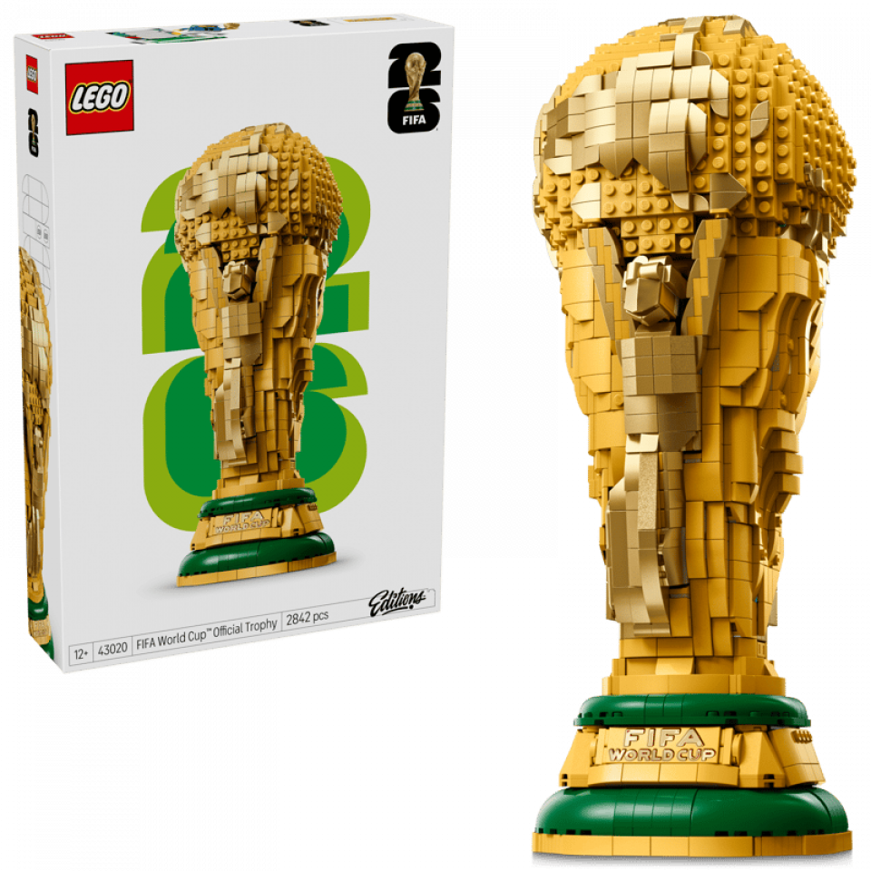 LEGO Editions 43020 FIFA World Cup Official Trophy bevat 2842 stenen en 1 minifiguur. Het model is 36 cm hoog. De prijs bedraagt €179,99. Releasedatum: 1 maart 2026. Aanbevolen leeftijd: 12+.