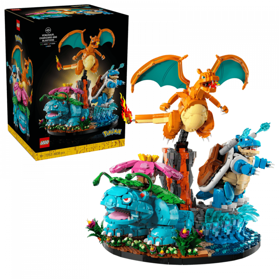 LEGO Pokémon 72153 Venusaur, Charizard & Blastoise telt 6838 stenen. Venusaur is 23 cm hoog, Charizard 20 cm en Blastoise 18 cm. De prijs bedraagt €649,99. Releasedatum: 27 februari 2026. Aanbevolen leeftijd: 18+. Inclusief GWP LEGO Pokémon 40892 Kanto Region Badge Collection.