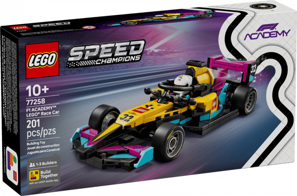 LEGO Speed Champions 77258 F1 Academy LEGO Race Car bevat 201 stenen en 1 minifiguur. De afmetingen zijn 4 cm hoog, 18 cm lang en 7 cm breed. De prijs is €27,99. Releasedatum: 1 maart 2026. Aanbevolen leeftijd: 10+.