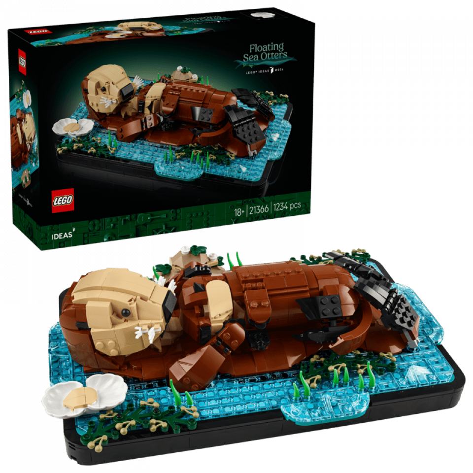 LEGO Ideas 21366 Floating Sea Otters telt 1234 stenen en meet 8 cm hoog, 30 cm breed en 19 cm diep. De prijs is €109,99. Releasedatum: 1 maart 2026. Aanbevolen leeftijd: 18+.
