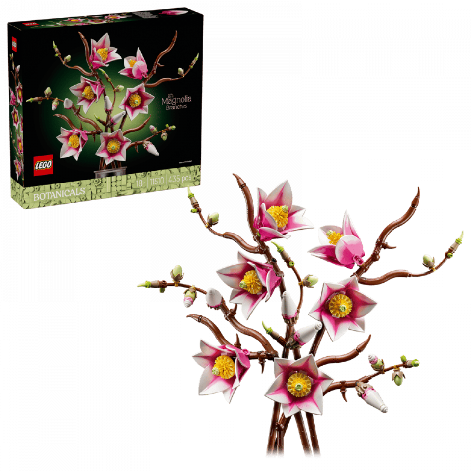 LEGO Botanicals 11510 Magnolia Branches bevat 435 stenen en meet 39 cm hoog, 44 cm breed en 11 cm diep. De prijs bedraagt €49,99. Releasedatum: 1 maart 2026. Aanbevolen leeftijd: 18+.